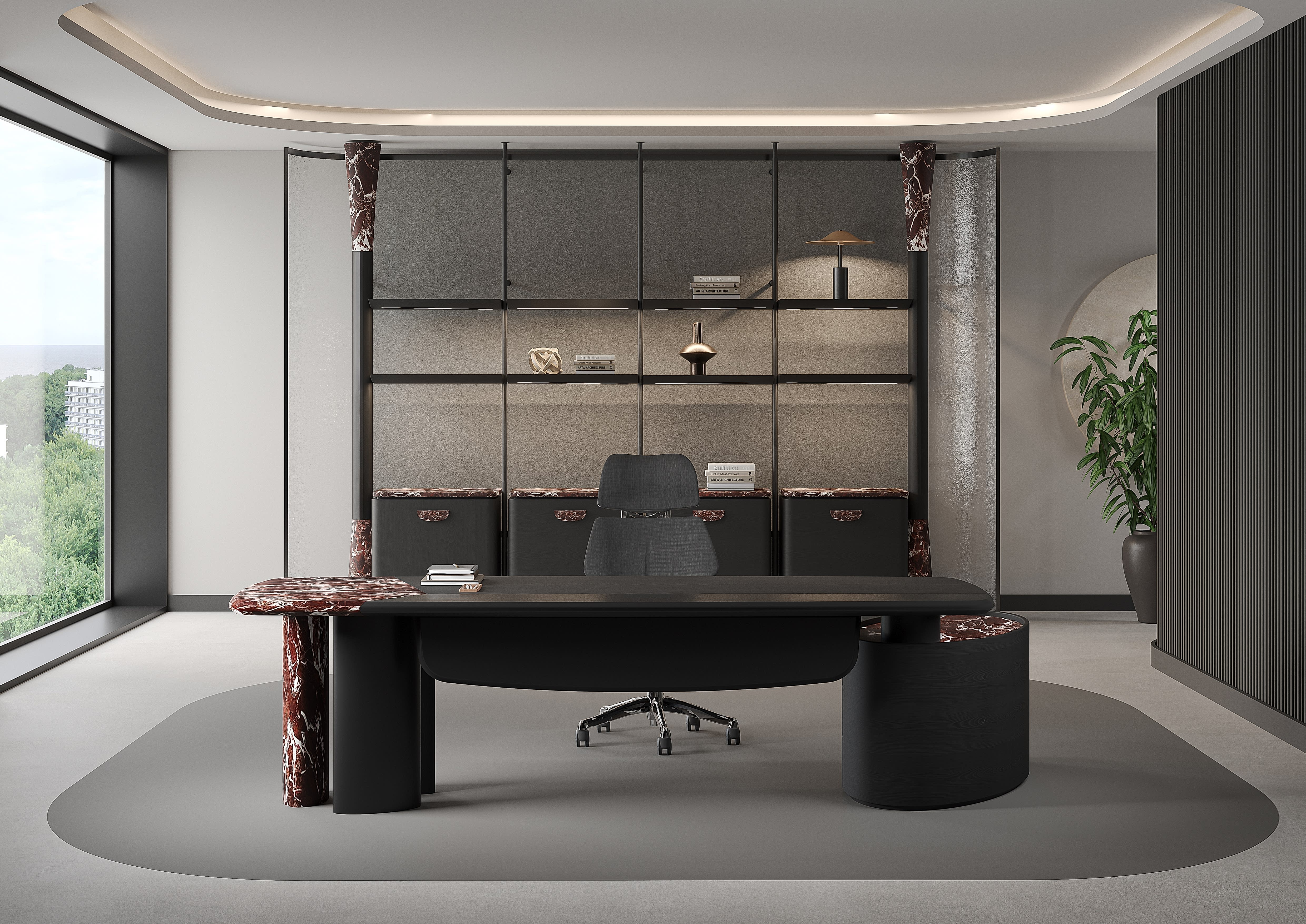 Kütlesel dengesi ve oval çizgileriyle mekânda sakin ama güçlü bir varlık oluşturur. Lorca, yalnızca bir çalışma alanı değil; yöneticinin mekânla kurduğu ilişkinin mimari bir parçasıdır.