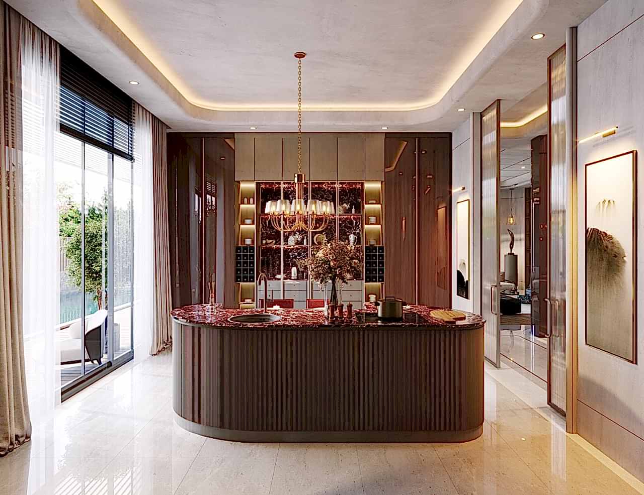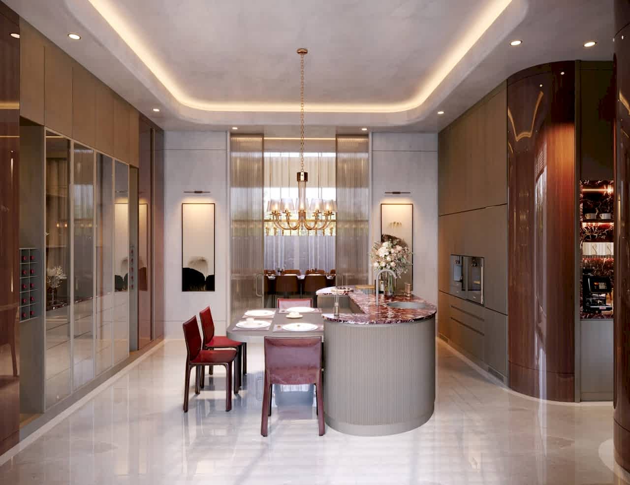 Nexus Regnum mutfakları; yüksek tavanlı hacimlere özel tasarlanmış, çift ada düzeni, geniş depolama çözümleri ve doğal taş–doğal kaplama birlikteliğiyle öne çıkar. Mermer yüzeyler, doğal ahşap kaplamalar ve mat yüzeyler; hem estetik hem de uzun ömürlü kullanım kriterleri gözetilerek seçilmiştir.