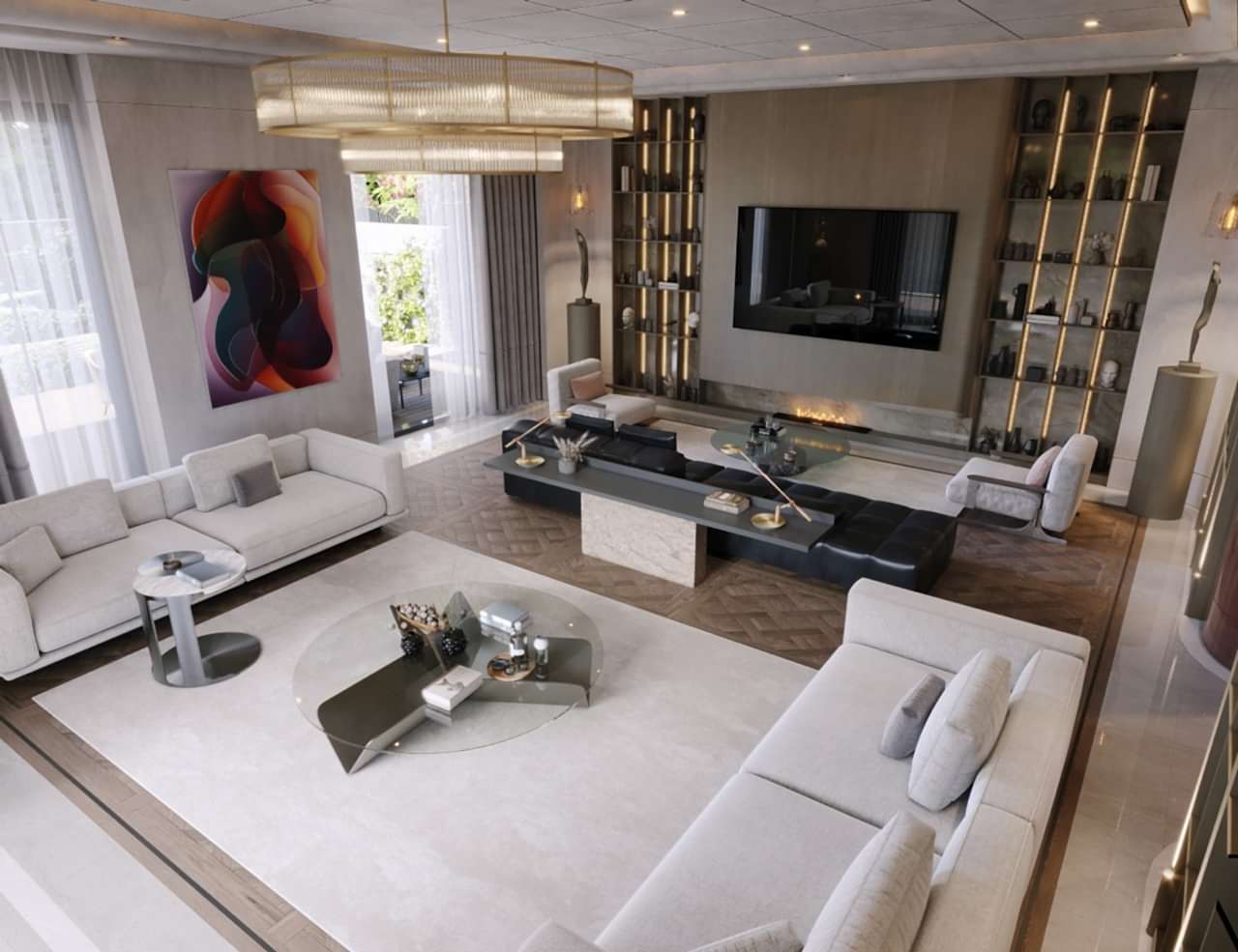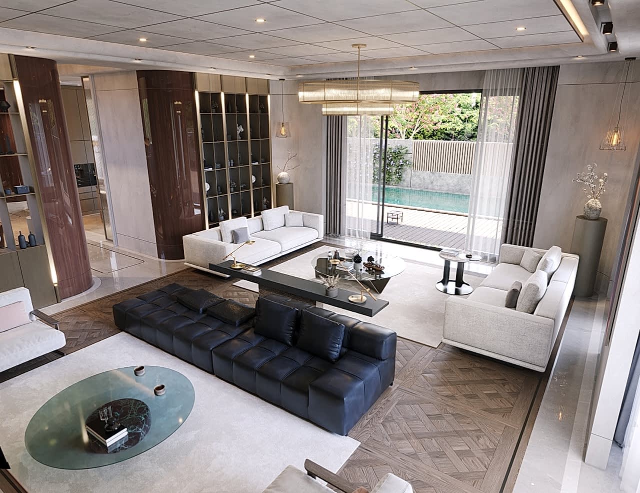 Salon ve ortak yaşam alanlarında kullanılan mobilyalar; mekânın akışını kesmeyen, hacmi destekleyen ve mimari bütünlüğü güçlendiren formlarla tasarlanmıştır. TV üniteleri, konsollar, kitaplık sistemleri ve özel depolama çözümleri; duvar yüzeyleriyle bütünleşerek sade ama güçlü bir mekânsal ifade oluşturur.