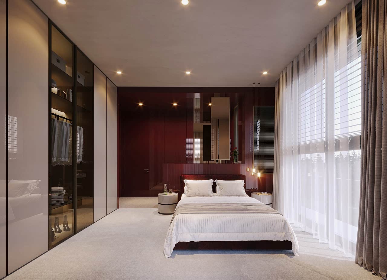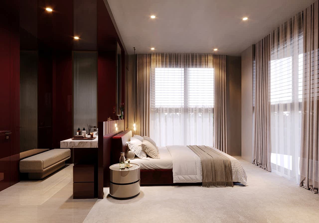 Yatak odaları ve giyinme alanlarında ise; fonksiyonel planlama ile zarif detaylar bir araya getirilmiş, kullanıcı alışkanlıklarına göre özelleştirilebilen dolap sistemleri geliştirilmiştir.