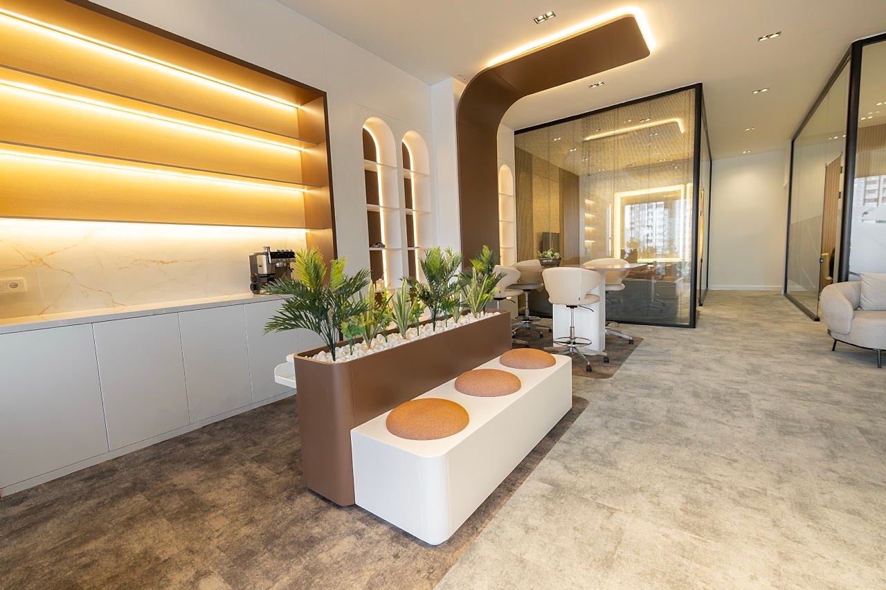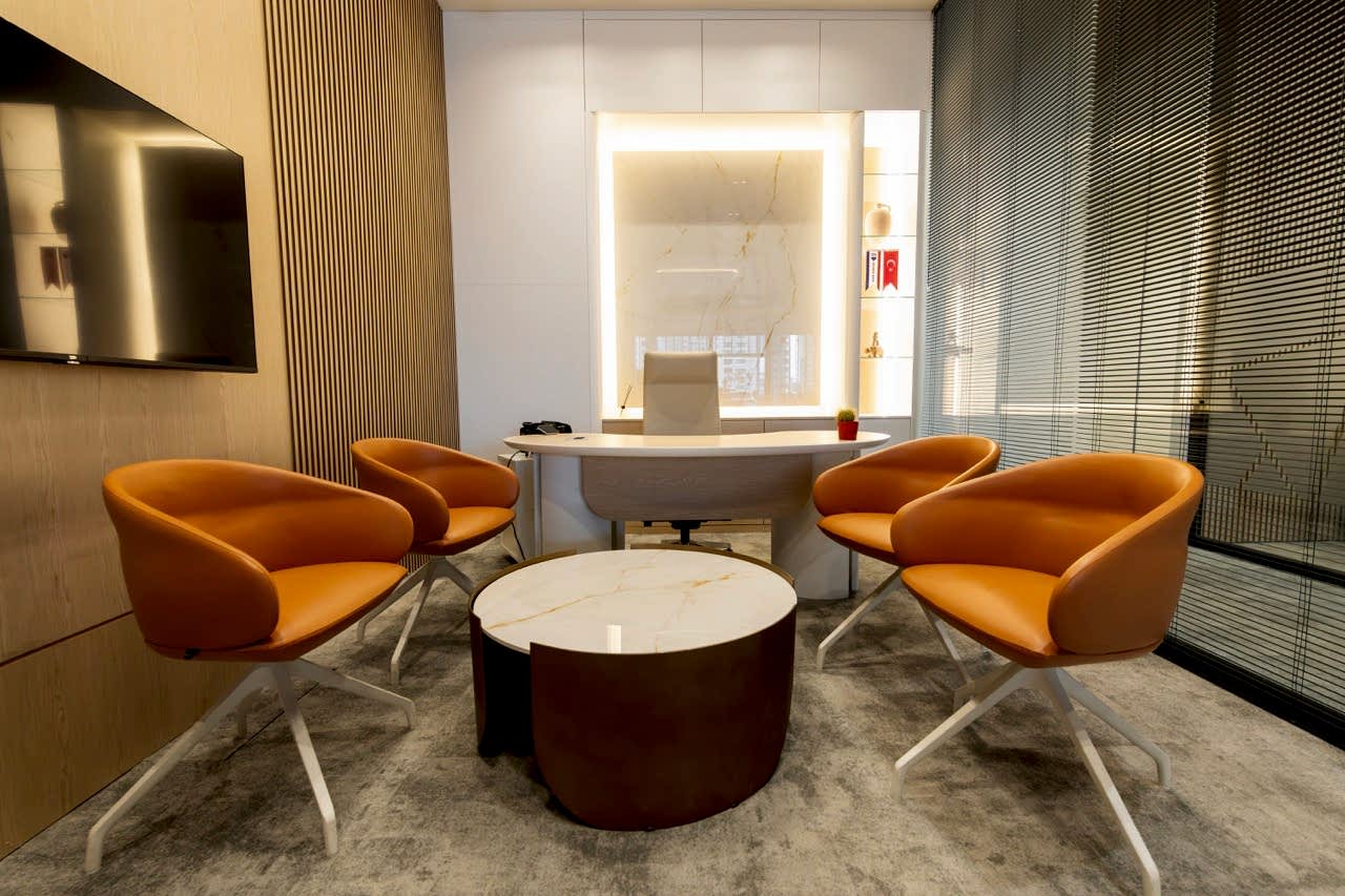 Mobilyalarda seçilen malzemeler, ölçüler ve yüzey detayları; mekânın profesyonel duruşunu güçlendirirken uzun ömürlü kullanım hedefiyle üretildi. Aydınlatma kurgusu ise hem fonksiyonel ihtiyaçları karşılayacak hem de ofisin mimari karakterini vurgulayacak şekilde tasarlandı.